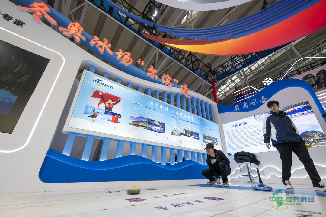 1月6日,在2026哈尔滨国际冰雪经济博览会上,参观者正在参与冰壶运动的现场体验。