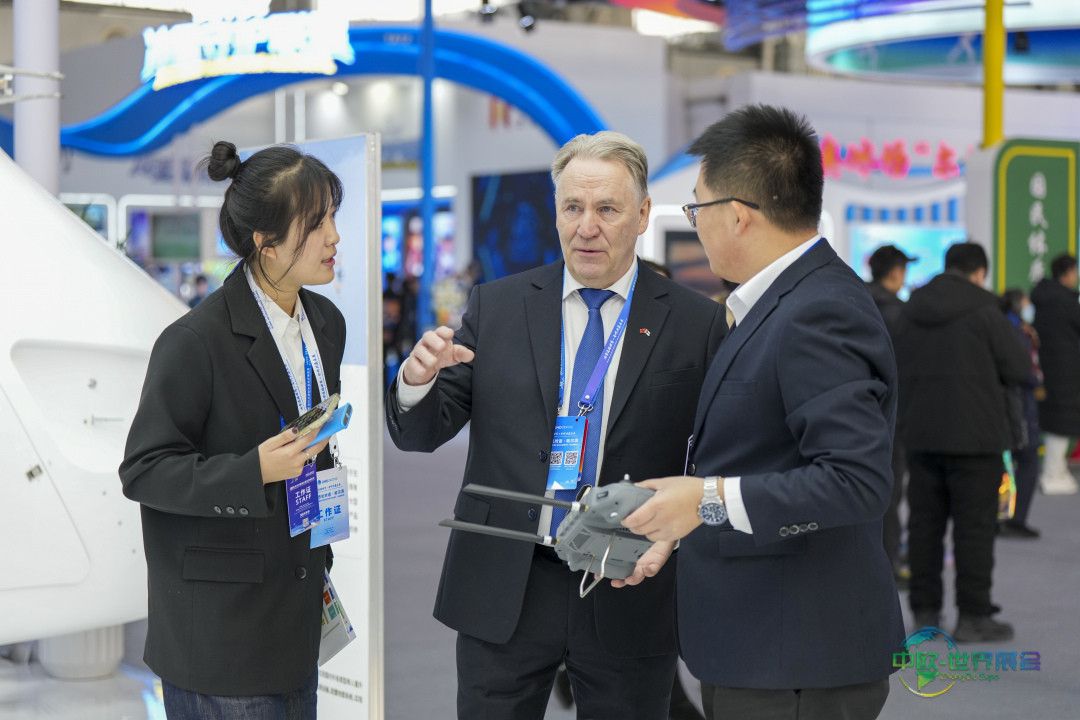 1月6日,在2026哈尔滨国际冰雪经济博览会的展馆内,与会嘉宾(中间)正在听取一款工业无人机的详细参数与性能介绍。