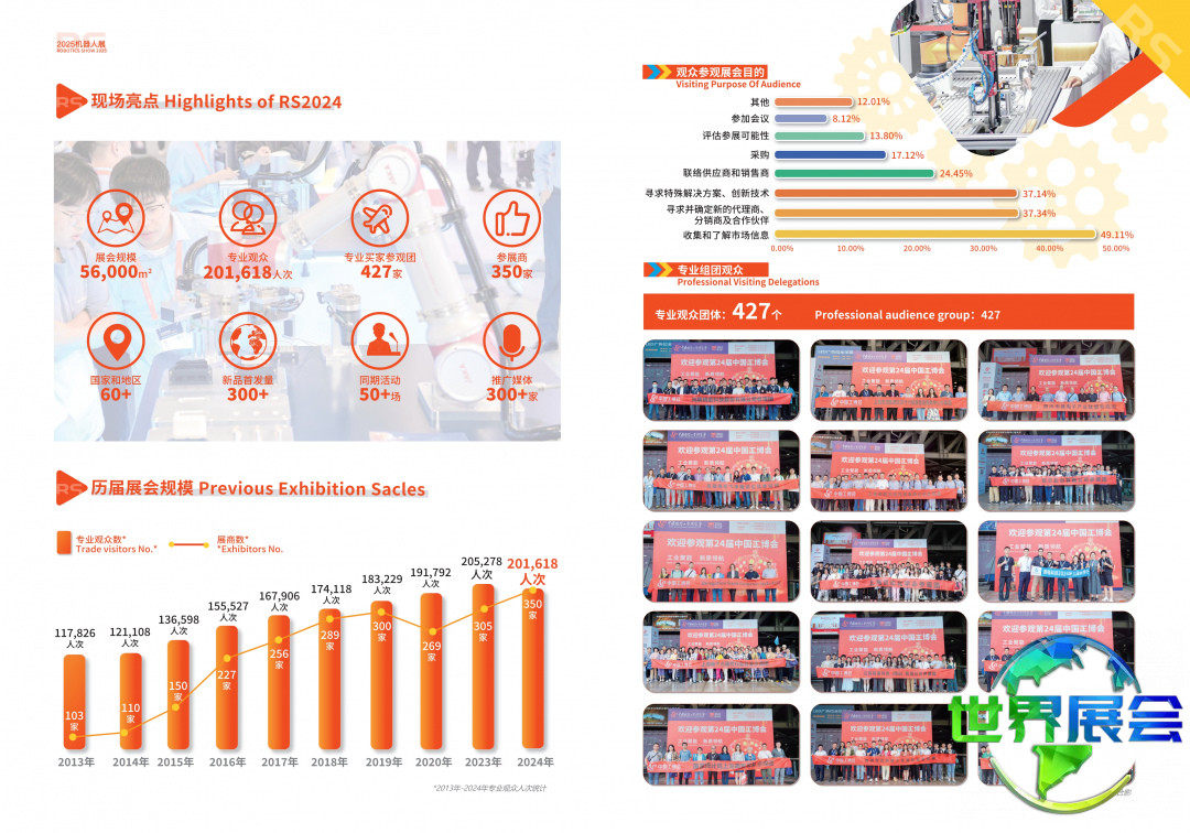 上海国际机器人展览会(RS)自2012年设立机器人展区,2013年首次独立设立工业机器人主题展,2015年更名为机器人展,2016年首次在展会内开设服务机器人体验专区与高校科研创新展示区,2017年设立“中国馆”和“国际馆”,至2018年深化“中国馆”和“国际馆”主题",已成为机器人行业的风向标,持续引领行业发展新潮流。