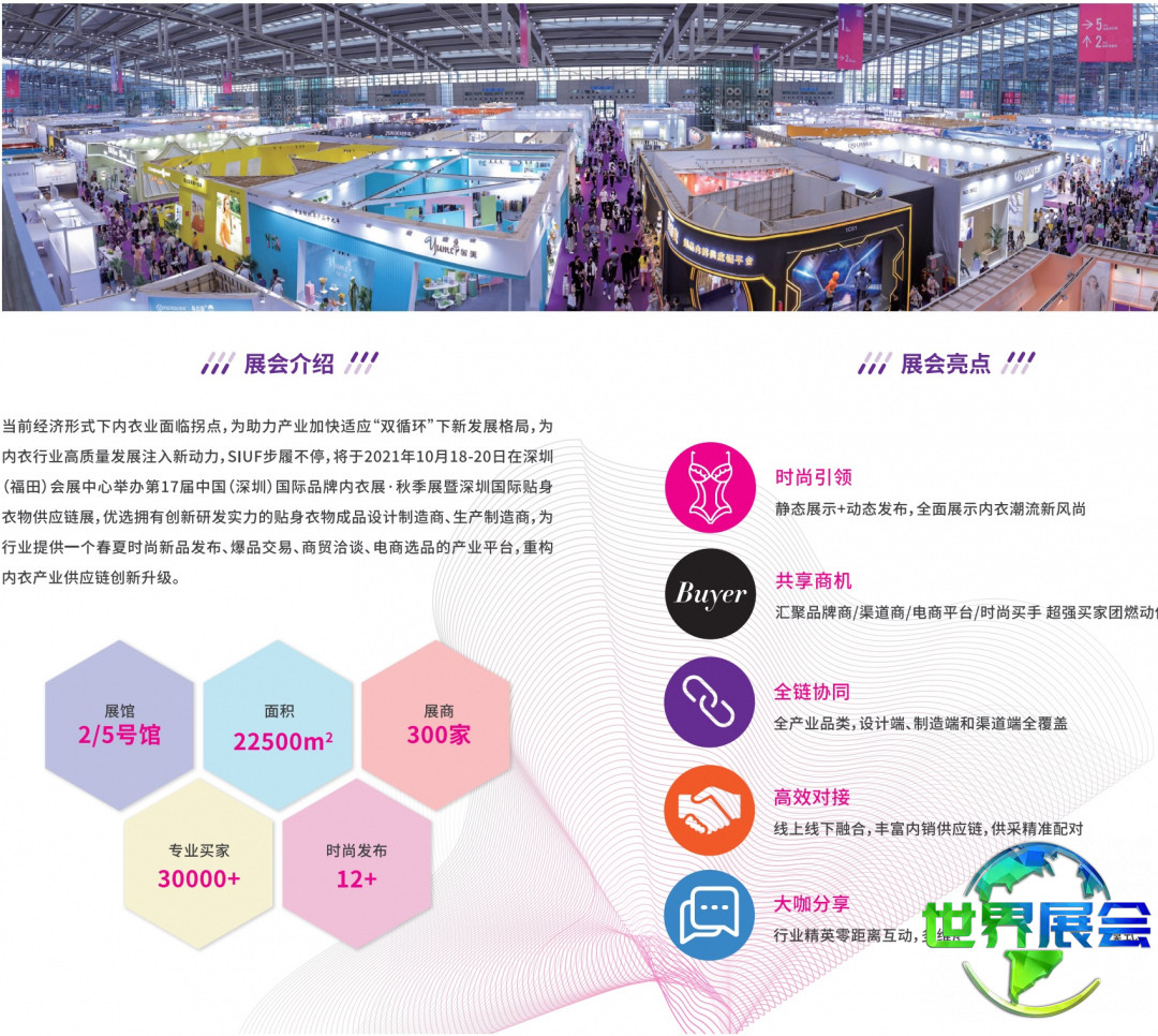 深圳国际品牌内衣展览会(SIUF)是国际品牌内衣及国内内衣产业基地展示的高端平台。以中国内衣产业为根基,以国际性品牌展览展示为核心,以促进行业与市场交流为目标,以建立区域内产业互联互通的信息体系为方向,致力于打造一个集内衣品牌推广、文化传播、展示交易、高端对话、市场开拓、财富创造于一体的国际化一流商务平台。