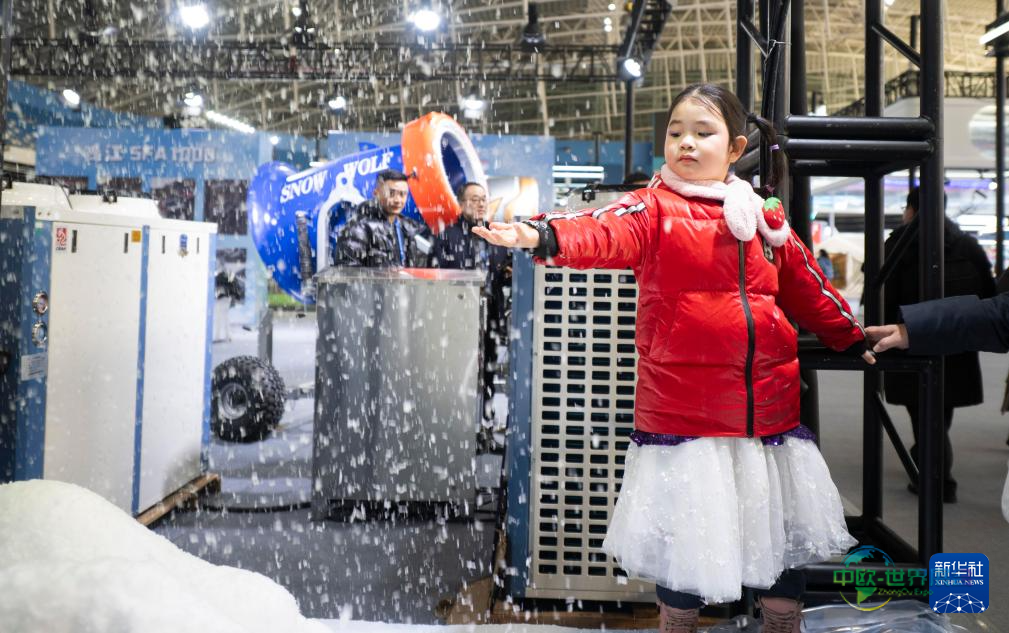 1月6日,在2026哈尔滨国际冰雪经济博览会冰雪设备展示区域,孩子们亲手触摸由造雪机现场制作出的雪花。