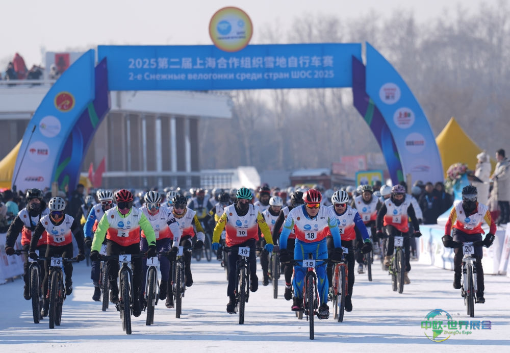 2025年1月11日,选手们在哈尔滨太阳岛风景区参加2025第二届上海合作组织雪地自行车赛。