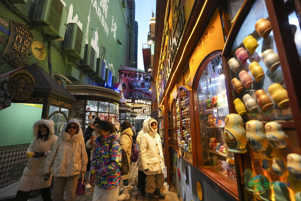 2025年12月16日,人们在哈尔滨中央大街肖克庭院景点参观游览。中央大街始建于1898年,全长1450米,由87万余块“面包石”铺就,享有“万国建筑博览馆”的称号。