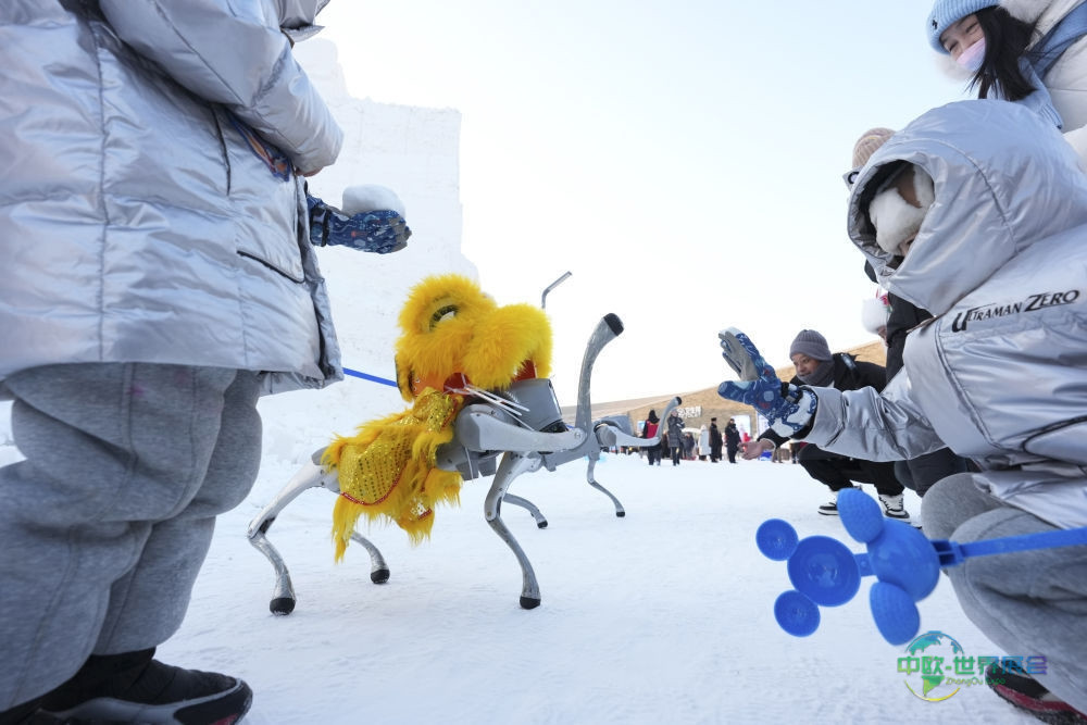 2025年12月17日,游客在哈尔滨冰雪大世界园区内与机器狗互动。