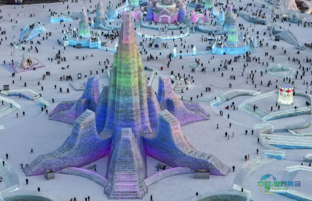图为2025年12月17日拍摄的第二十七届哈尔滨冰雪大世界园区内的冰建筑景观(无人机拍摄)。园区占地达120万平方米,总用冰用雪量超过40万立方米,以空前宏大的规模,打造出一个“冰天雪地”般的“童话王国”。