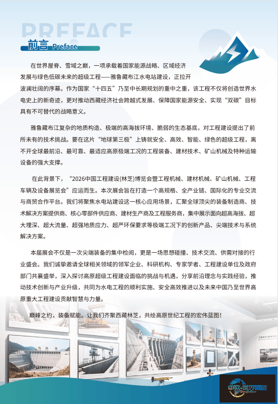 基于此,“2026中国工程建设(林芝)博览会暨工程机械、建材机械、矿山机械、工程车辆及设备展览会”顺势而生。本次展会致力于构建一个高层次、覆盖全产业链、具有国际影响力的专业交流与商业合作平台。我们将以水电站建设为核心议题,集结全球领先的设备制造企业、技术方案解决商、关键零部件供应商、建材厂商及工程服务提供商,集中呈现针对超高海拔、超深埋设、超大流量、超强地质活动及严格环保标准等极端施工环境所研发的创新产品、前沿科技与系统性解决方案。