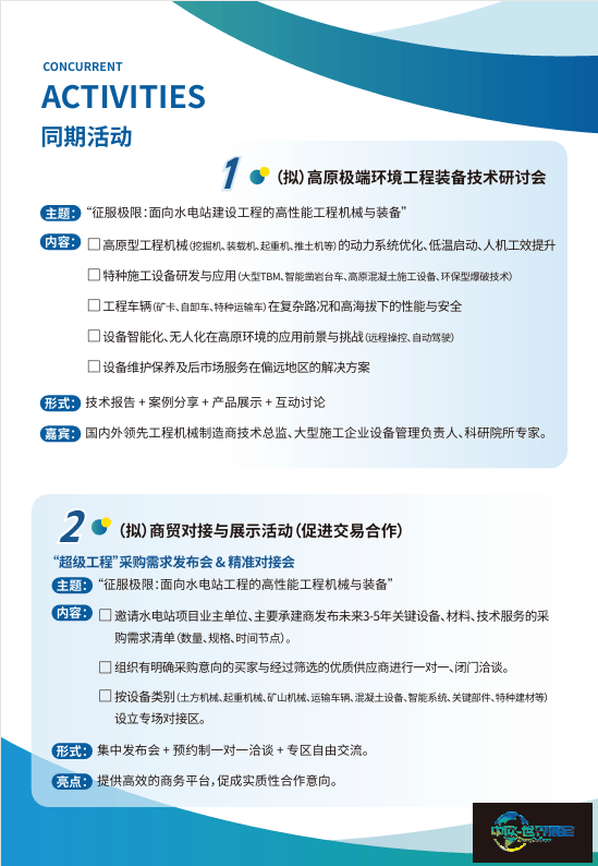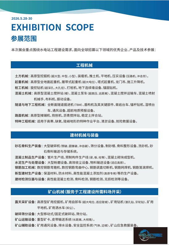 此次盛会不仅是对尖端工程装备的一次集中展示,更是一场汇聚行业智慧、促进技术研讨、实现供需匹配的专业峰会。我们热忱欢迎全球相关领域的龙头企业、研究机构、资深专家、工程建设方及政府代表齐聚一堂,共同深入剖析高原超级工程所面临的挑战与机遇,分享先进的理念与实操经验,推动技术创新与产业进步,齐心协力为水电项目的顺利建设与安全高效运行,以及未来中国乃至全球范围内的高原重大工程建设,贡献宝贵的智慧与力量。