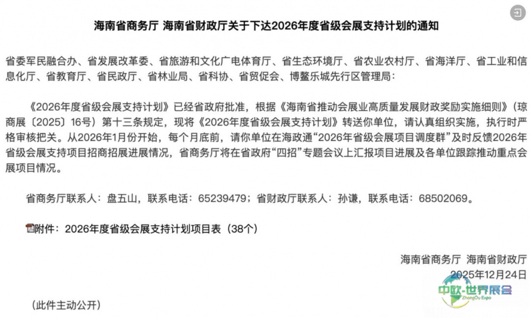 根据海南省商务厅官网发布的信息,《2026年度省级会展支持计划》已获省政府批复。今年,海南省计划对38个省级会展项目予以支持,涵盖10场专业展览与28场专业会议,活动举办地涉及海口、三亚、琼海、儋州、文昌等多个城市。