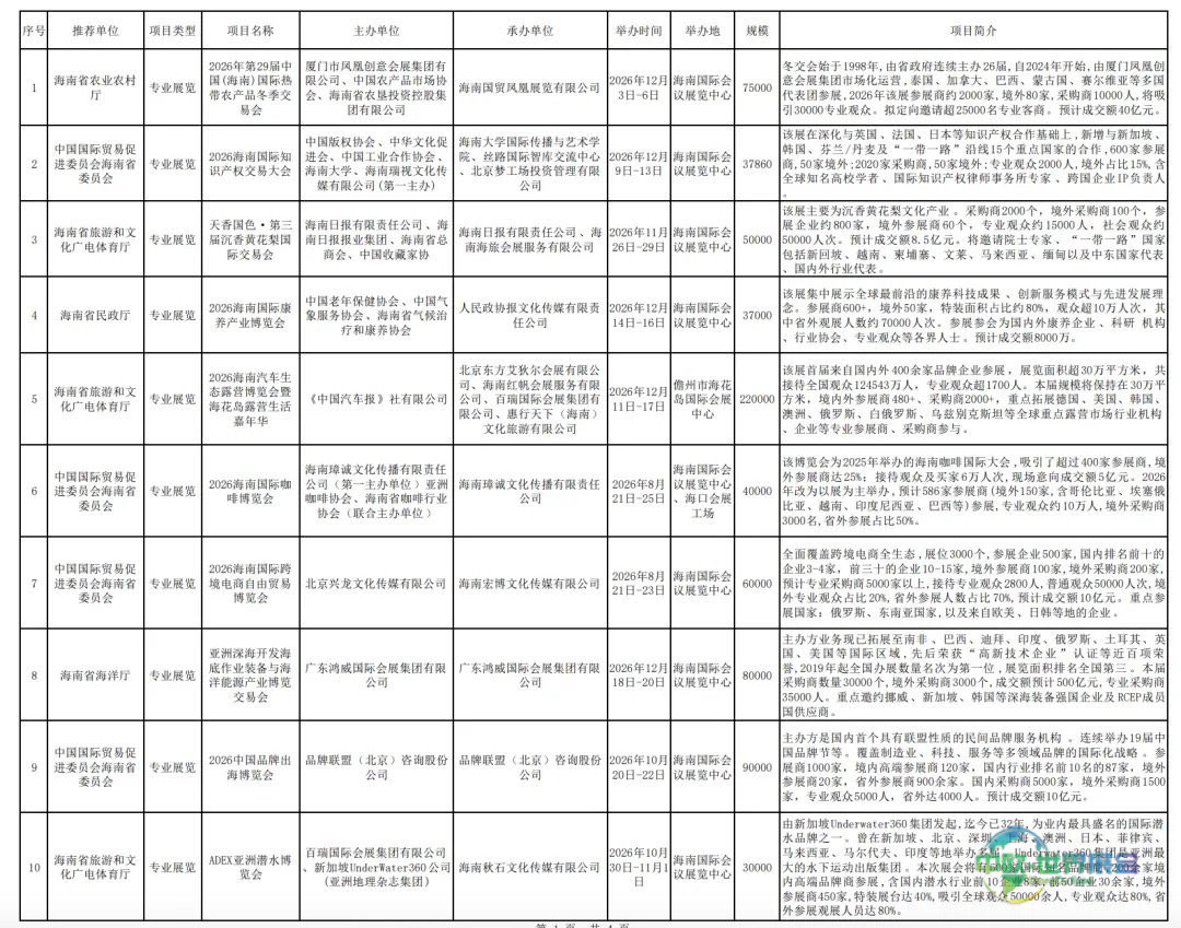 10场专业展览具体包括:2026年第29届中国(海南)国际热带农产品冬季交易会、2026海南国际知识产权交易大会、天香国色·第三届沉香黄花梨国际交易会、2026海南国际康养产业博览会、2026海南汽车生态露营博览会暨海花岛露营生活嘉年华、2026海南国际咖啡博览会、2026海南国际跨境电商自由贸易博览会、亚洲深海开发海底作业装备与海洋能源产业博览交易会、2026中国品牌出海博览会以及ADEX亚洲潜水博览会。
