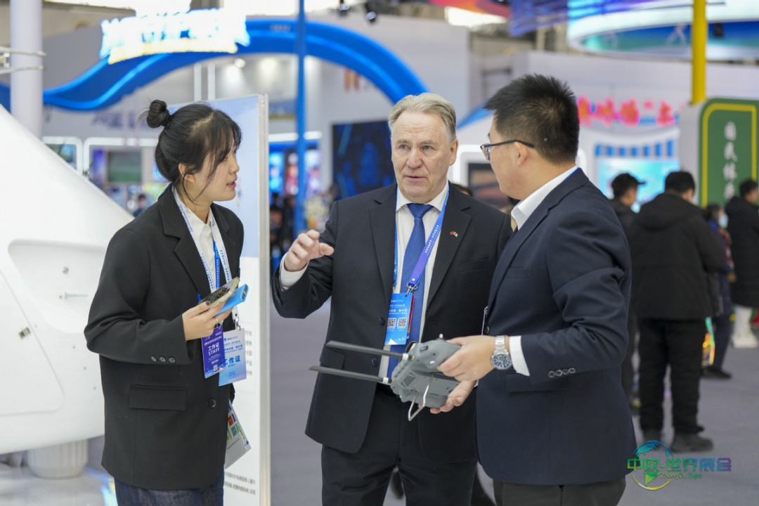 1月6日,在2026哈尔滨国际冰雪经济博览会现场,参会嘉宾(中)在了解一款工业无人机的参数和性能。新华社记者 王松 摄