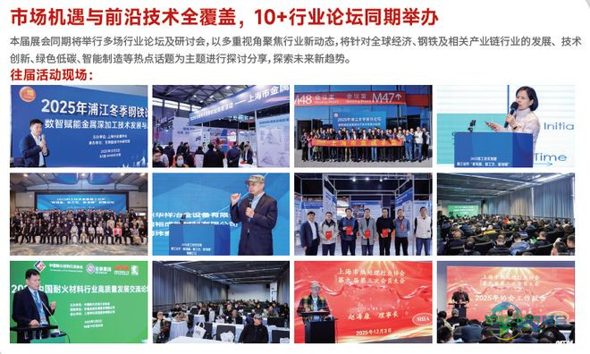 本届展会期间将举办多场行业论坛及专题研讨会,从多元角度剖析行业最新动向,围绕全球经济、钢铁及其关联产业链的发展、技术突破、绿色低碳、智能制造等焦点议题展开深入讨论与经验分享,共同探寻未来发展趋势。