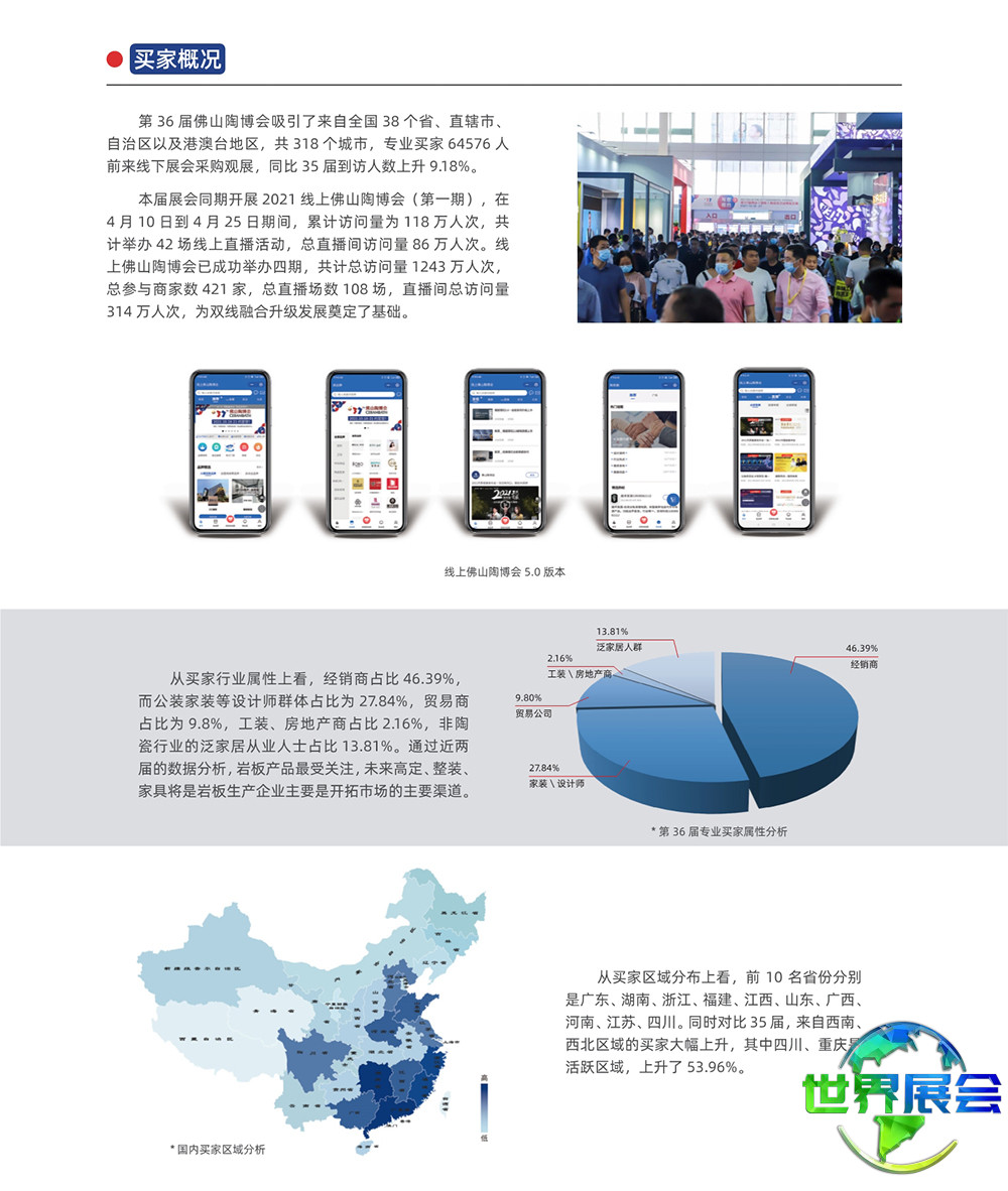 佛山国际陶瓷及卫浴展-佛山陶博会(CERAMBATH)被行业广泛认可为继意大利博洛尼亚陶瓷卫浴博览会Cersaie、西班牙瓦伦西亚陶瓷卫浴展Cevisama以及美国国际石材及瓷砖博览会Coverings之后的世界第四大国际性陶瓷及卫浴博览交易会。它是中国境内陶瓷及卫浴品牌参与度最高、规模最大、集聚效应最显著、专业性最强的行业展览,是中国陶瓷、卫浴产品通向世界市场的重要窗口。
