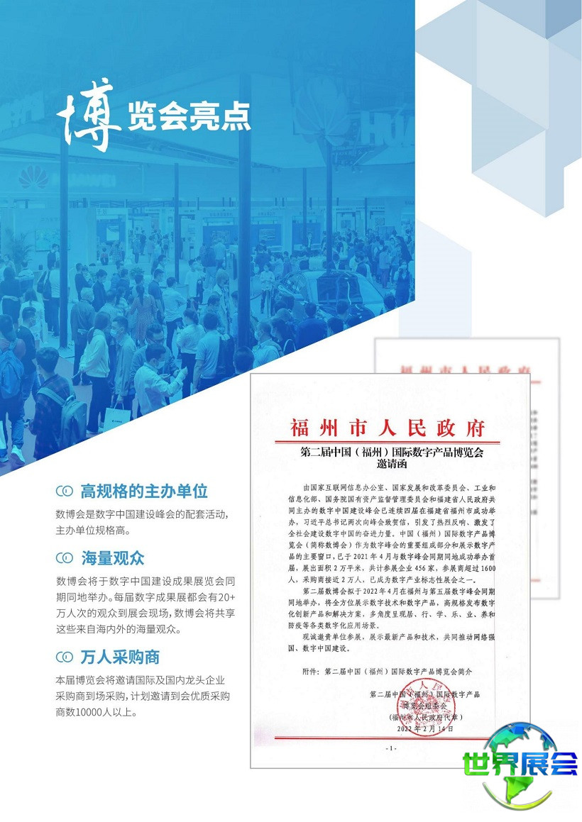 2026年4月1日至4月1日,万众期待的数字中国建设峰会-福州数博会将于福州海峡国际会展中心盛大开幕。中欧世界展会网为意向参展商提供展位申请与预订等一站式服务。