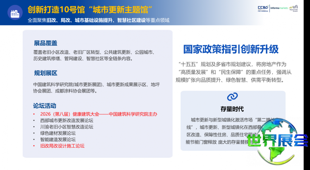 城市更新已成为推动城市持续发展的关键动力。川渝地区现有住房面积超过10亿平方米,老旧小区改造和局部更新政策不断实施,展现出广阔的市场前景。2026中国成都建博会准确抓住这一战略机会,全力打造10号馆城市更新主题馆,围绕旧城改造、局部更新、城市基础设施升级、智慧社区建设四大重点方向,为产业链相关企业搭建起连接中西部市场的专业平台。