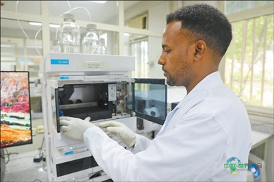 在埃塞俄比亚农业部下属的动物产品与投入品质量检测中心,质量分析师法努埃尔正在对样本进行检测。本报记者 沈小晓摄