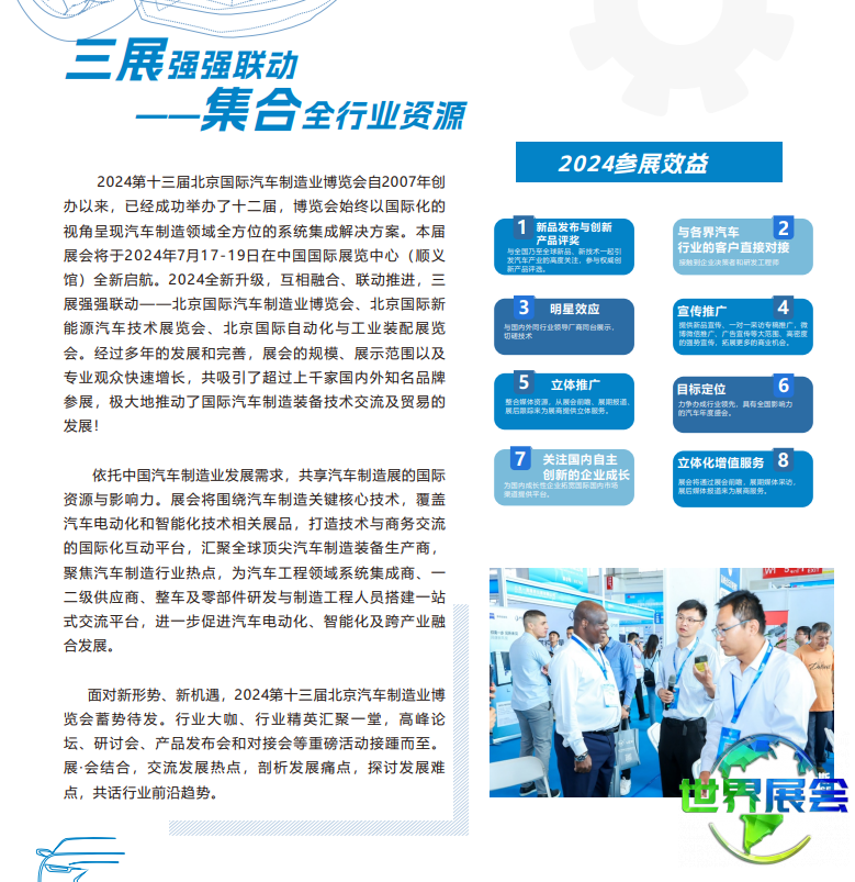 本信息由中欧世界展会网工作人员编辑整理。我们是一个整合全球展会时间地点、门票购买、展位申请、设计搭建服务的平台,为您提供专业的北京汽车制造展展位预订支持。