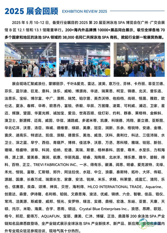 经过多年的发展与沉淀,该展会已成为全球泳池与SPA行业顶尖品牌汇聚的舞台,也是业内交流合作、把握发展趋势的核心平台。每年此时,行业从业者都如同期待节日般翘首以盼,因为在这里可以窥见整个行业未来的发展脉络。可以说,错过这场展会,就可能错失一整年的行业前沿动态!