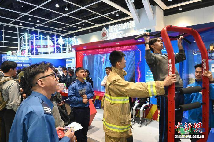图为一名男学生(右二)在香港特别行政区政府消防处的展台内参与体能评估。中新网记者 李志华 摄