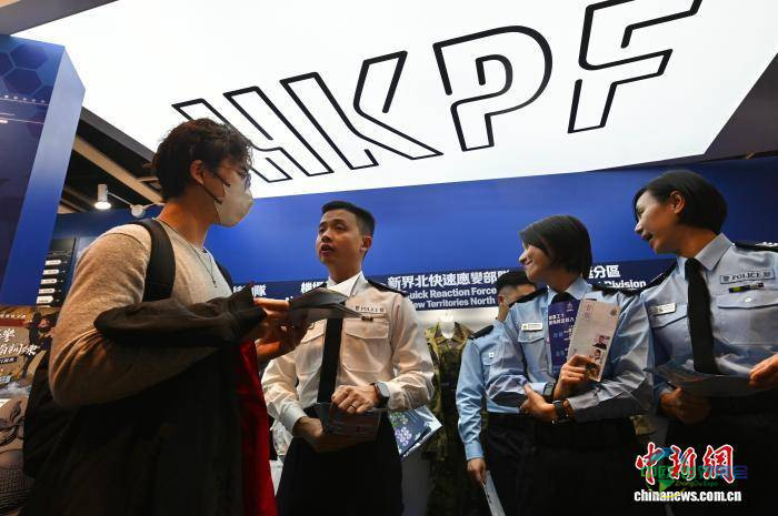 图为一位男士(左一)在香港特别行政区政府警务处的展台内与警员沟通。中新网记者 李志华 摄