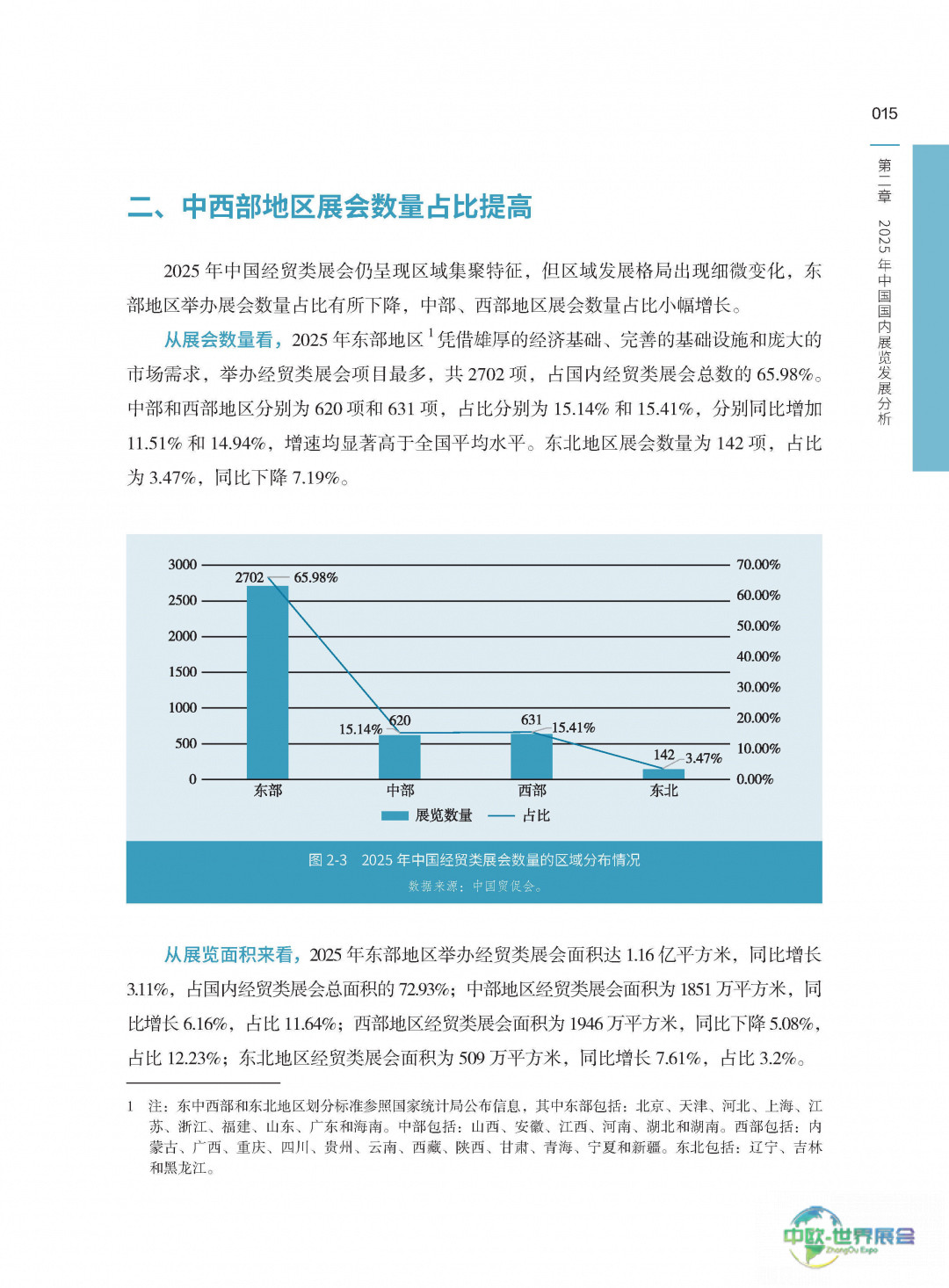 据报告数据,2025年全国范围内举办的面积在2000平方米以上的经贸类展会共计4095场,总展览面积达到1.59亿平方米,较上年分别增长6.53%和2.5%,活动覆盖了全国31个省、市、自治区。区域发展更趋平衡,东部地区依托其扎实的产业基础依然占据主导地位,举办了2702场展会,占总数的65.98%。然而,中西部地区显示出强大的增长潜力,展会数量同比增幅分别达到11.51%和14.94%,增长速度明显快于全国整体水平。京津冀、长三角和珠三角三大城市群仍然是展会活动的核心区域,贡献了全国53.85%的展会数量和62.48%的展览面积。其中,长三角地区以举办1179场展会、展览面积4941万平方米的成绩,在三大区域中位居榜首。