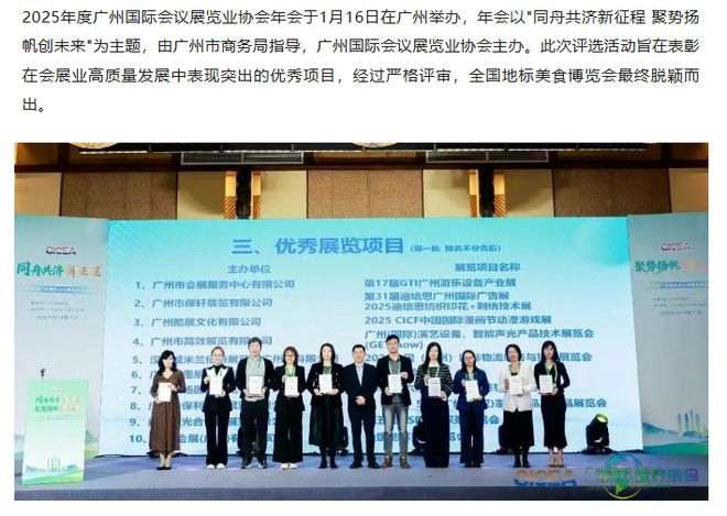 最近,在2025年广州国际会议展览业协会年度会议上,由沸点会展(广州)有限公司承办的"全国地标美食博览会"获评为"2025年度优秀展览项目"。这一荣誉充分体现了该展览在促进地方特色美食产业进步和会展行业创新方面所做出的显著成绩。