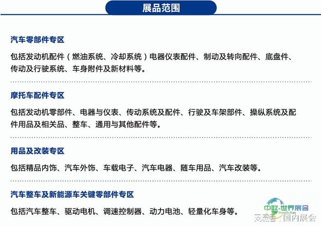 从传统零部件到新能源科技,从国内市场到全球舞台,2026义乌国际汽摩配博览会已超越普通展会的范畴,升级为整合产业链资源的战略平台和企业开拓海外市场的“黄金通道”。展品覆盖全产业链关键类别,精准匹配外贸采购需求:既包括发动机配件、制动系统、轮胎轮毂等传统必需品类,汇聚了来自山东河北的刹车片、广东汽车电子等全国18个省(区、市)产业带的源头厂商;也重点展示新能源汽车三电系统、智能座舱、充换电设备等前沿产品,同时呈现汽车用品改装、美容养护、摩托车配件等细分领域的优质商品,超过95%的展品专供外贸,可直接满足批量采购需求。