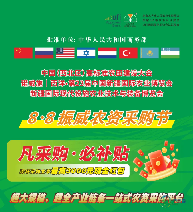 诺威施|西洋•第二十三届中国新疆国际农业博览会定于8月8日至9日,在新疆国际会展中心举行。同期还将举办第十四届新疆国际种子交易会、第四届新疆水利科技博览会、现代设施农业展览以及植保与绿色防控展览。
