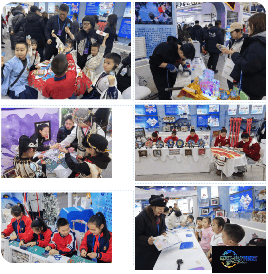 展区集合了中小学校、高等学府、冰雪运动俱乐部、研学机构等多种参与方,通过图片文字展板、实物展示、视频资料等形式,全方位呈现冰雪教育的成就。现场专门设置了冰雪装备科技互动区域,展出冰雪检测仪器等现代设备,强调冰雪教育的科技元素。互动体验区格外受欢迎,参观者能够亲自尝试冰尜制作、冰雪非遗手工剪纸、冰版画、麦秸画、鱼皮画、桦树皮画等项目,在动手操作中体验冰雪文化和技艺的独特吸引力。展区还安排了合作洽谈与研学咨询专门区域,为教育机构和相关企业搭建高效的交流平台。