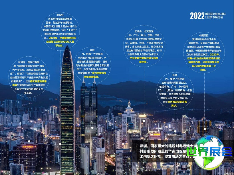 该展会在全球范围内也位居前列,展现了其作为行业“引领者”的专业水准与成熟魅力。深圳国际复合材料工业技术展览会(CCE)由中国复合材料集团有限公司主办,致力于将每一届展会都打造成企业家的庆典、行业的盛会,其专业形象、品牌影响力及行业地位获得了政府相关部门的有力支持。