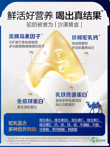 2. 新疆真驼奶的严格标准:8斤鲜驼奶仅制成1斤原始黄金奶粉,营养密度非常高;坚持只使用双峰驼单一基因,绝不掺入一滴牛羊奶,严格执行驼奶新国家标准;生鲜驼乳最快在2小时内从牧场直接运至工厂,锁住新鲜与活性成分。