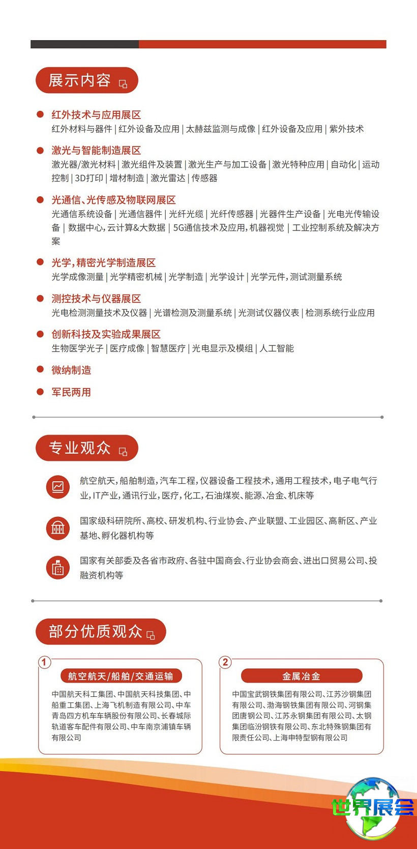 自2009年首届成功举办后,凭借中国光学工程学会雄厚的行业资源集聚优势,大会吸引了海内外业界领军企业展示其前沿成果与创新实践案例。覆盖光电子全产业链,关注行业实际应用,为生产商提供新视角与解决途径,实现与终端采购商的精准匹配。依托学会资源带来强劲的科研采购需求,汇聚高等院校、国家级科研机构、国家重点实验室、国家工程中心及技术研发单位。
