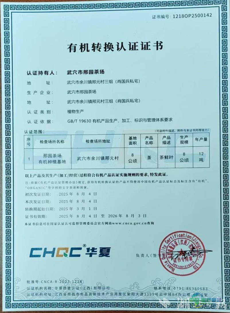 “守护老茶园却不固守陈规,传承匠心更勇于开拓创新。”肖国政与邢园茶场的交集,已持续四十多年。幼年时常跟随老一辈茶人穿行茶园,习得种茶、采茶、制茶的传统技艺;如今执掌茶场,他带着岁月积淀的深情,引入新技术、开拓新渠道,在一芽一叶中,亲历这座老茶园的焕新蜕变。2007年“邢园青峰”商标成功注册,2009年引种“安吉白茶”取得突破,2015年建成清洁化加工车间,2020年获得“绿色食品”认证,2025年又成功取得有机转换认证。面对茶叶,肖国政始终像个充满求知欲的学生,保持着孜孜不倦的学习热情,时常自费走访各地茶园、参与各类大型茶业博览会,他花费整整十二年光阴,终于在中国茶叶研究所考取国家一级品茶师资格。“每一步都走得不易,但看到茶叶品质不断提升,心里比喝了香茶还要甘甜。”肖国政感慨道。