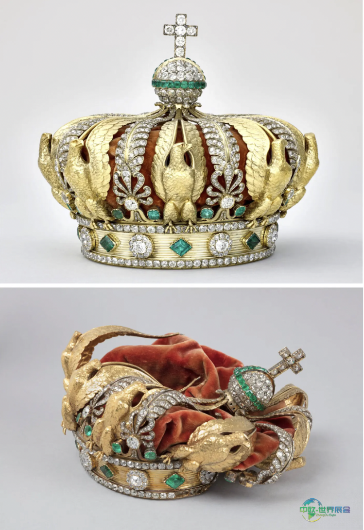 据了解,这顶装饰有8只金雕雄鹰并镶嵌大量祖母绿和钻石的皇冠,是拿破仑三世(法国末代皇帝,拿破仑的侄子)当年定制的一套头饰中的一件,供其夫妇二人在1855年巴黎“万国博览会”开幕式上佩戴。该皇冠由皇帝的御用珠宝商监督制作,共镶嵌了1354颗钻石、1136颗玫瑰式切工钻石以及56颗祖母绿。