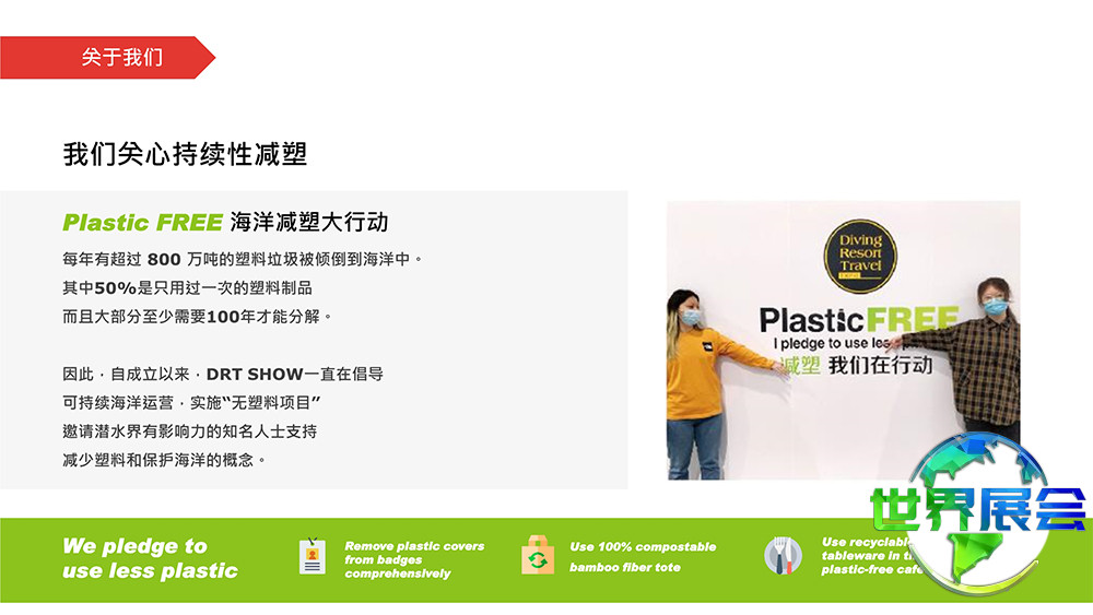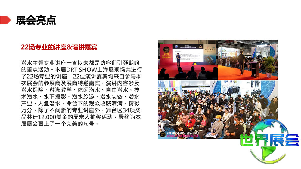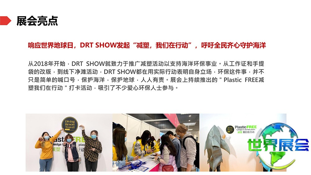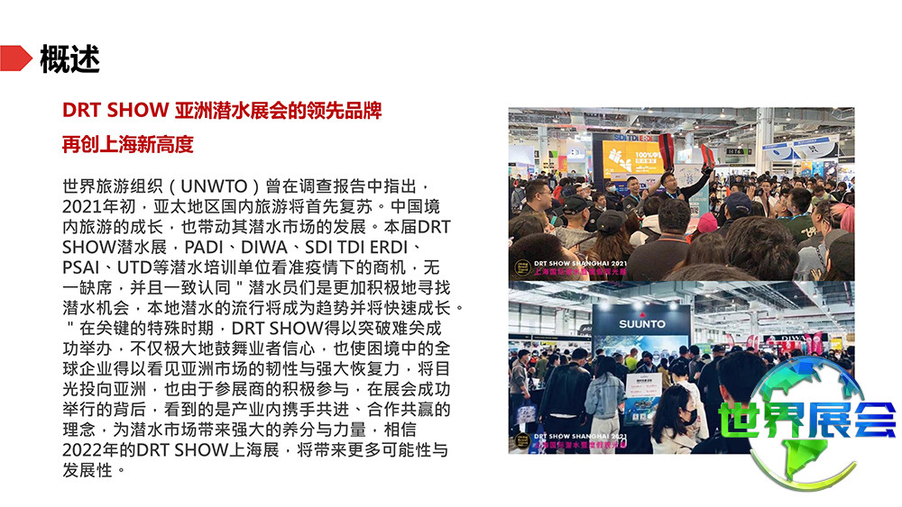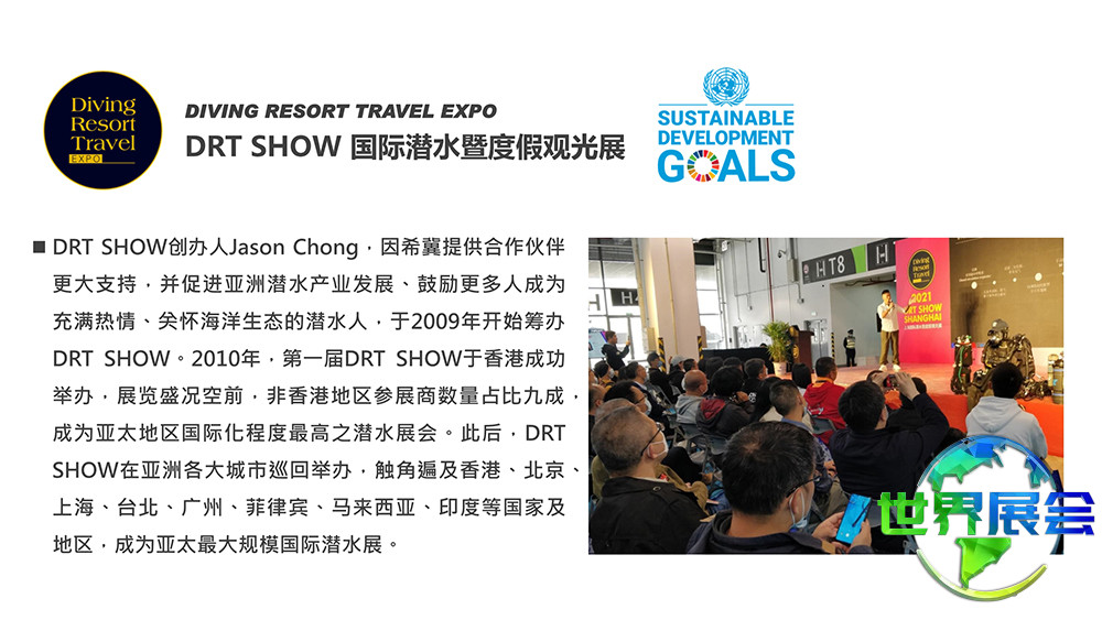 上海国际潜水及度假观光展(DRT SHOW)是亚太区域规模最大的专业B2B/B2C潜水与度假旅游展览。它汇聚了潜水领域最新、最专业、最全面的行业资讯。每年设置超过2500个展位,同时吸引来自全球65个国家和地区逾45万名专业采购商及观众到场。