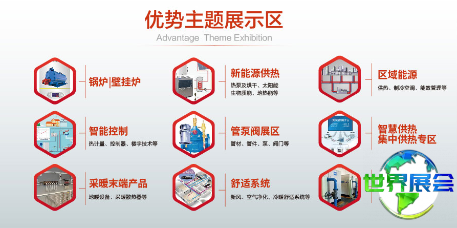 暖通空调产品与技术:锅炉、壁挂炉及其配件;通风与空调设备;地暖系统及配件;热泵设备及配件;太阳能、生物质能产品;热计量设备及配件;电加热设备及配件;仪器仪表与供热信息服务;毛细管网与天花板辐射采暖系统;散热器及配件;泵、阀门、管件;其他相关产品