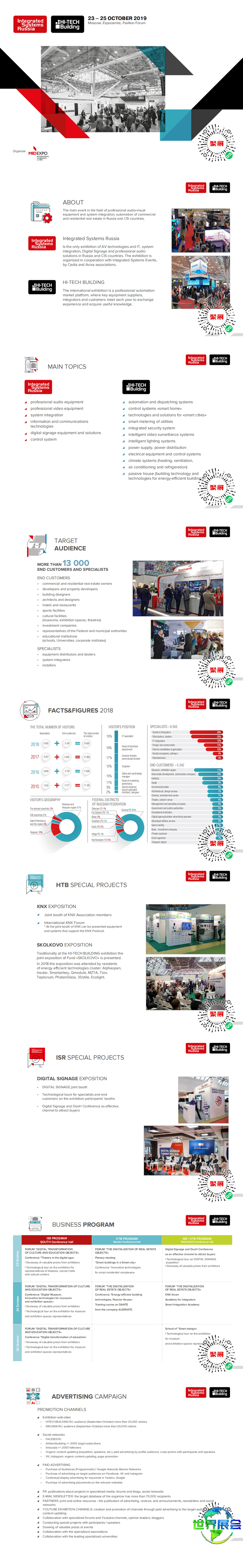 俄罗斯莫斯科视听技术与系统集成展ISR汇聚了视听领域的系统集成商、设计师、专业顾问、销售代理、分销商以及其他相关行业人士,如建筑师、工程师、承建商、IT专业人士、视听设备经理、室内设计师。同时,专业观众群体也扩展至教育、政府、安防、商业、住宅及宗教等各领域的终端用户。