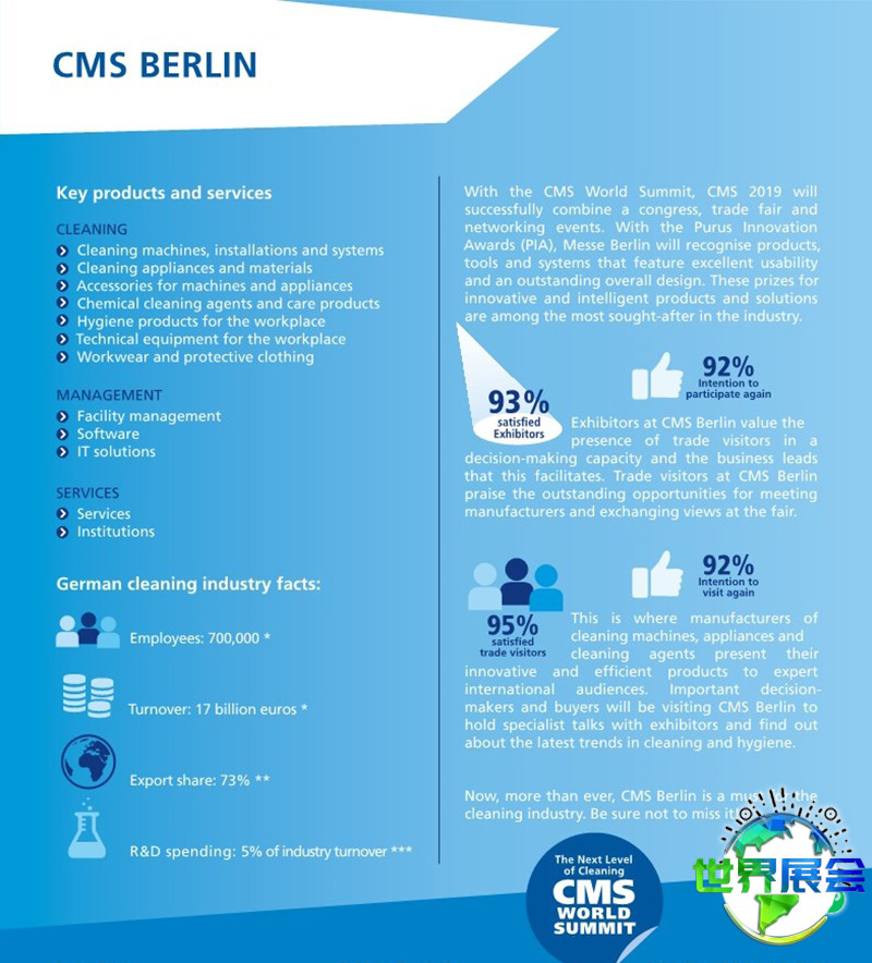 作为欧洲规模领先的清洁用品与设备展览会之一,德国柏林清洁设备展览会(CMS Berlin)是清洁系统与基础设施服务行业建立新联系、维护老客户及促成商业交易的理想平台。其行业领导地位,使之成为欧洲清洁业界聚会的首选之地。