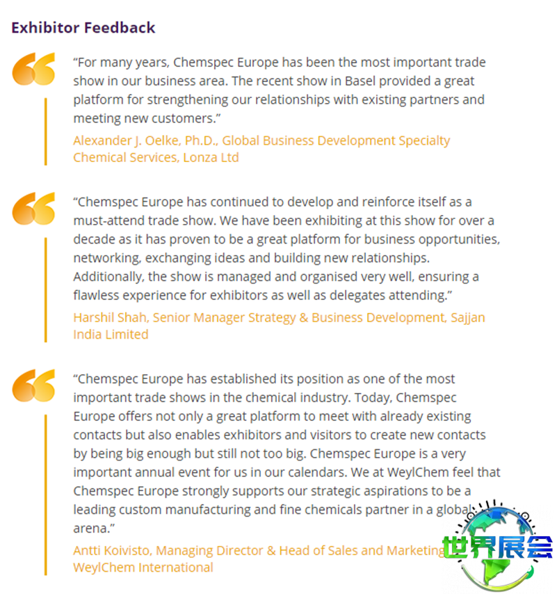 欧洲精细化工展览会(Chemspec Europe)每年均吸引包括中化集团、中石化集团、鲁西化工、天元集团、联化科技在内的众多中国企业参展,展商回头率超过65%,不少企业已连续参与7至8届,且展位面积持续增长。