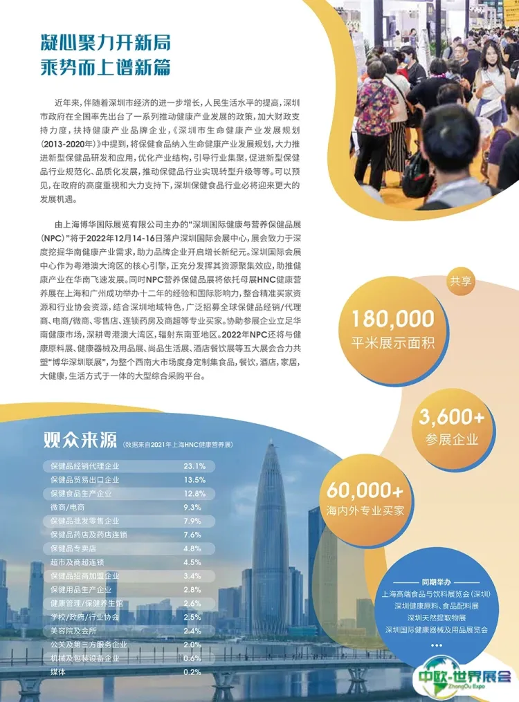 深圳国际健康与营养保健品展览会(HNC)将以国际化的运作和高效化的商贸展会组织模式,为展商和观众打造中高端营养保健品市场一流的贸易平台,与来自全球的专业买家分享行业资讯,在优质的展商汇聚中找到最合适的商业伙伴。