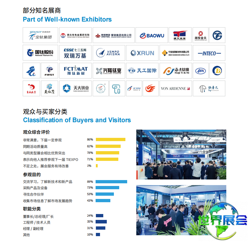 中国国际钛业展览会(简称TIEXPO或钛博会)于2005年首次举办,是国内钛领域历史较为悠久的展会之一。它由行业组织、龙头企业及地方政府共同发起创立,历经两届发展,现已成长为全球最具规模的专业性展览。其展示范围覆盖全产业链,成为业内企业进行品牌推广、商业合作、产品营销以及信息互通的首选平台,集产、学、研、用于一体。