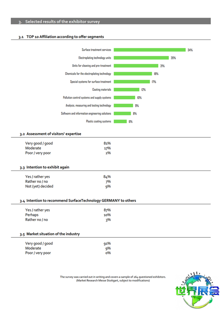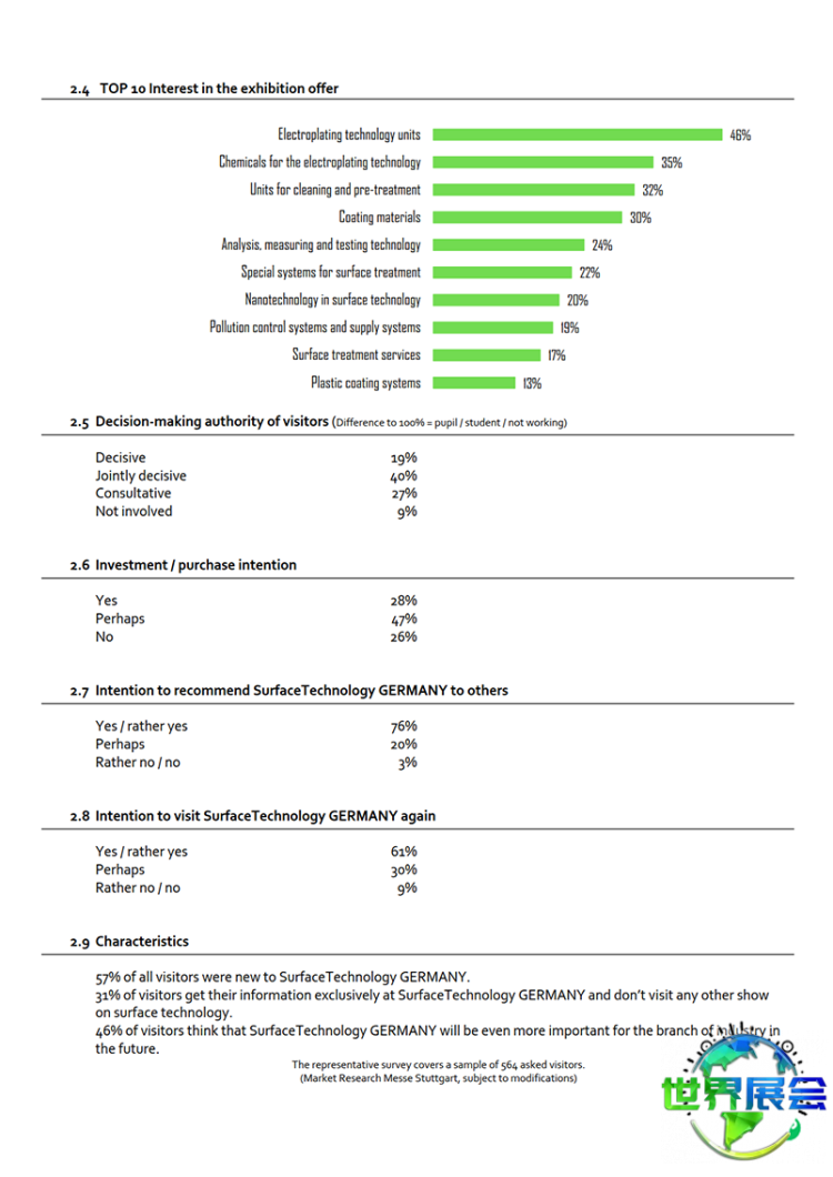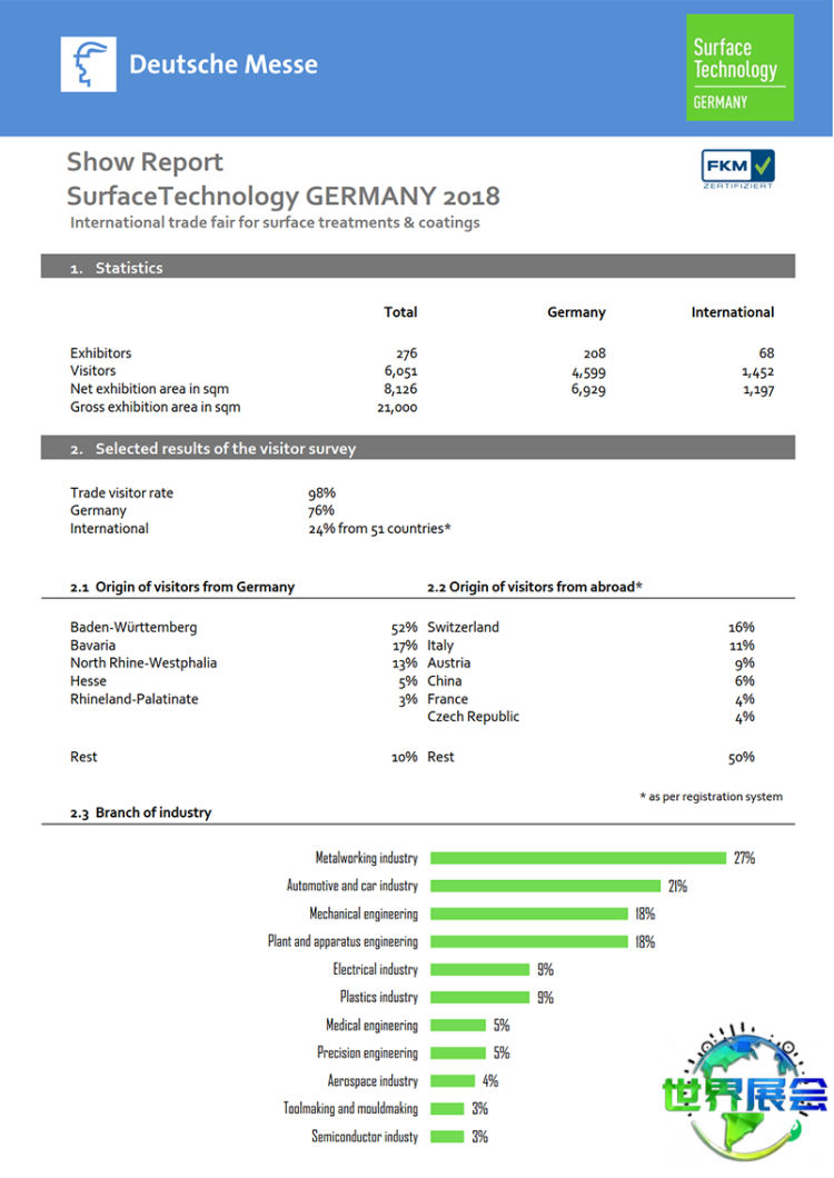 德国斯图加特表面处理展览会(SurfaceTechnology)上一届展会总面积达15000平方米,参展商274家分别来自中国、韩国、日本、美国、澳大利亚、俄罗斯、波兰等国,参观者数量为10800人。据调研反馈,表面技术测量检测设备、电镀工艺、表面技术废水净化处理等内容最受参观者青睐。
