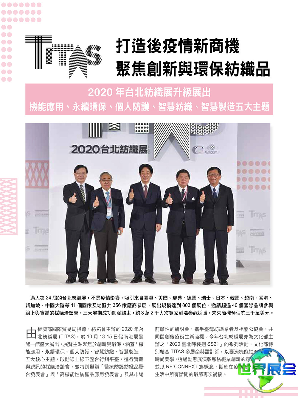 台塑企业、远东新世纪、力丽集团、旭荣集团、儒鸿、集盛以及纺织产业综合研究所等业界重要单位均将参与。为促进本地纺织业者与国际买家的持续对接,台湾纺织面料展(TITAS)积极邀请来自美国、加拿大、英国、德国、意大利、西班牙、荷兰、挪威、瑞典、南非、澳大利亚、新西兰、日本、韩国及孟加拉等15个关键市场的超过71个国际品牌前来进行采购。