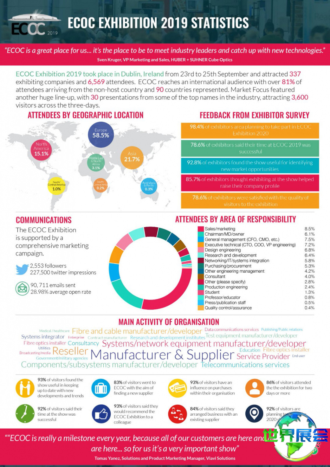 欧洲通信电信技术博览会(ECOC)上一届展出总面积20000平方米,400家参展商分别来自中国、韩国、日本、新加坡、阿联酋迪拜、捷克、泰国、中国香港、意大利、俄罗斯、挪威、美国、澳大利亚、加拿大、巴西、土耳其等多个国家和地区,现场接待专业观众15700人次。