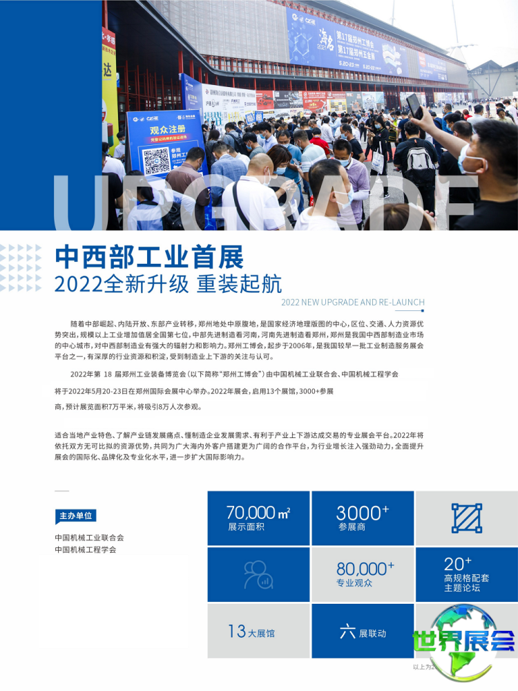 郑州国际机床展览会(CZME)是中西部地区交易规模最大、行业影响力最强的专业机床展会。由中国机械工程学会主办。旨在推动中部工业装备领域进步,引入先进设备与技术,复兴中部地区装备制造工艺,增强本地工业技术的创新实力,同时为参展企业打造一个集交流与销售于一体的商务平台。