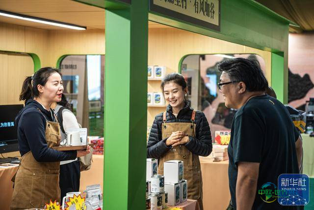 ↑ 12月5日,参会商在活动现场向顾客介绍咖啡产品。