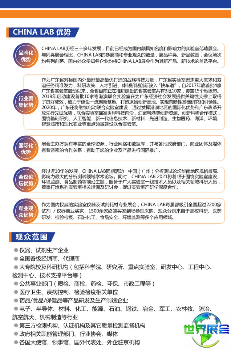 广州国际分析测试及实验室设备展览会(CHINA LAB)致力于服务实验室技术与建设的全产业链,以华南为基地,覆盖中国及整个东南亚区域,以实验室仪器设备、试剂及消耗品为重点,涵盖实验室规划、设计、建造、运营、软件、管理、投资等方面,通过展览与论坛等形式为实验室领域专业人士打造宣传、贸易、交流与学习的互动平台,为实验室提供全面解决方案。