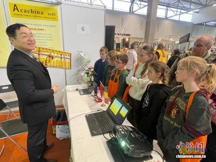 中比学院院长、比利时上海友好协会会长秦治官在展位介绍中国珠算,吸引了许多孩童停留观看。中新网记者 德永健 摄