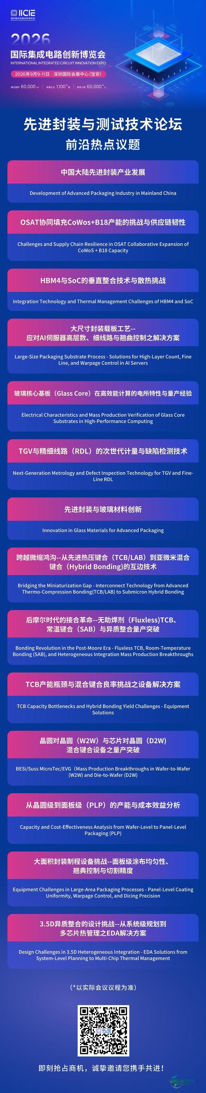 我们热忱欢迎您参加本次先进封装与测试技术论坛,与全球封测领域的精英人士共聚深圳,共同探寻AI时代下从CoWoS到CoPoS的技术发展路径,攻克先进封装的核心挑战,对接全产业链优质资源,携手共建集成电路特色产业生态,共同描绘产业高质量发展的崭新蓝图!