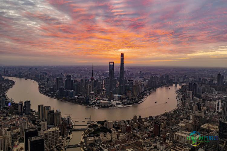 上海陆家嘴的朝霞景象(摄于2022年1月1日,无人机拍摄)。