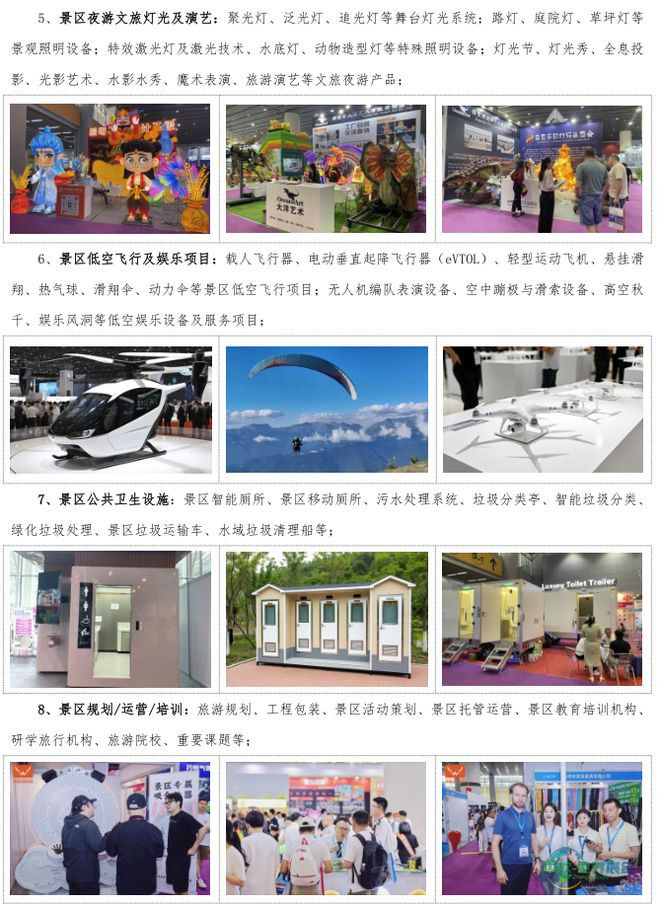 景区内的水陆交通观光设施,例如观光车、游船等,有助于游客在景区内轻松通行,畅游各处景观;景区旅居/休闲设施,如特色民宿、露营帐篷等,为游客提供惬意的住宿与休憩场所;景区公共卫生设施,像环保垃圾桶、智能卫生间等,能维护景区环境的清洁卫生;景观照明设施,运用灯光艺术塑造绚丽夜景,为景区增添别样风采;商业/体育设施,诸如特色商铺、户外运动场地等,丰富了游客的游玩内容。智能化设备同样是该展区的重要看点,景区旅游系统、票务系统等,可实现客流监测、智能票务管理等功能,提升景区的运营效率与服务品质。而景区网红游乐设施,如玻璃栈道、彩虹滑道、悬崖秋千等,凭借其独特的体验感和视觉震撼力,吸引大量游客前来体验,成为景区的热门打卡点,有效增强了景区的知名度与吸引力。